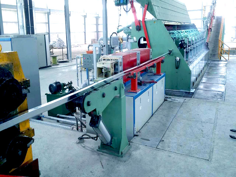 久達(dá)鋁合金桿生產(chǎn)線采用新型四輪式水平澆鑄連鑄機(jī)和4+10連續(xù)軋制生產(chǎn)工藝。生產(chǎn)¢9.5mm的鋁合金桿 (鋁合金牌號(hào)為導(dǎo)電圓鋁桿1系列,鋁錳3系列,鋁鎂硅6系列、8系列)。鋁合金桿生產(chǎn)中,水平澆鑄連鑄機(jī)保證鋁液平穩(wěn)澆鑄,大大減少生產(chǎn)造渣情況。感應(yīng)加熱器有效保證鑄坯進(jìn)軋的工藝溫度要求,具有鑄錠加熱調(diào)節(jié)功能。連軋機(jī)具有主動(dòng)喂料和堆桿停車功能,連續(xù)淬火裝置有在線淬火功能,收線導(dǎo)管出口處裝有吹水裝置,以清除鋁合金桿表面水分,同時(shí)安裝有主動(dòng)牽引裝置,保證鋁合金桿的順利導(dǎo)出。圓弧導(dǎo)向管采用滾輪導(dǎo)向結(jié)構(gòu),減少鋁合金桿表面擦傷。繞桿方式為離心甩頭式,一方面使鋁合金桿在進(jìn)入收線框前給予預(yù)變形;另一方面使其在軋制過程中若發(fā)生斷桿,桿尾能自動(dòng)到收線框內(nèi)。使其換盤時(shí)不亂桿,以保證連續(xù)雙盤成圈裝置進(jìn)行收線。